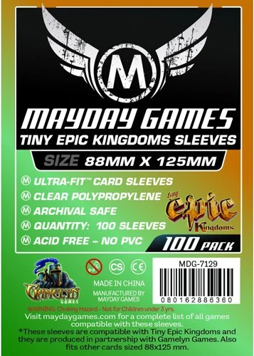These card sleeves are custom sized to fit any card that is 88 X 125 MM in size. One such game is Tiny Epic Kingdoms*.