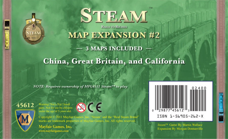 Steam: Map Expansion #2 provides three maps in the same pack that can be used with the Steam base game. One side of the four-panel game board features a map of Great Britain suitable for 3-4 players that’s subtitled “Progress from Canals to Rails”. The other side of the game board has two maps, each covering two panels of the game board: California 2090 (“Gain Prestige but Prepare for Disaster” for three players) and China (“Unite the Country on the Floodplains” for 2-4 players).