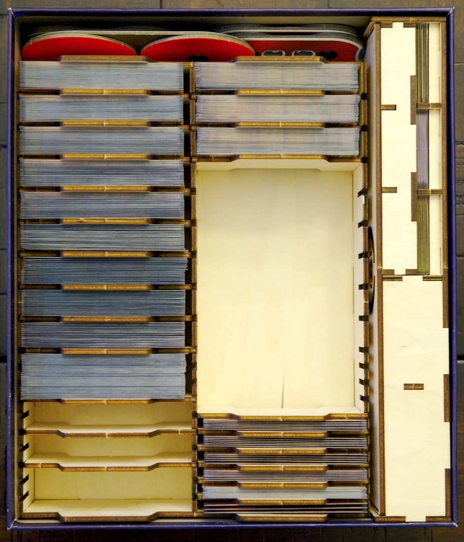 - Card trays can accommodate sleeved cards, including the status cards.