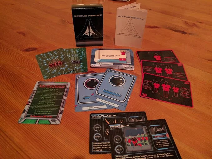 Status Report! is a 10-20 min social deduction game for 3-5 players. One person acts as the Captain of a spaceship and everyone else plays the ships on-board AI. Unfortunately for the Captain only one of these AI is still operational, decided by a role cards, the rest are out to kill them and the crew.
