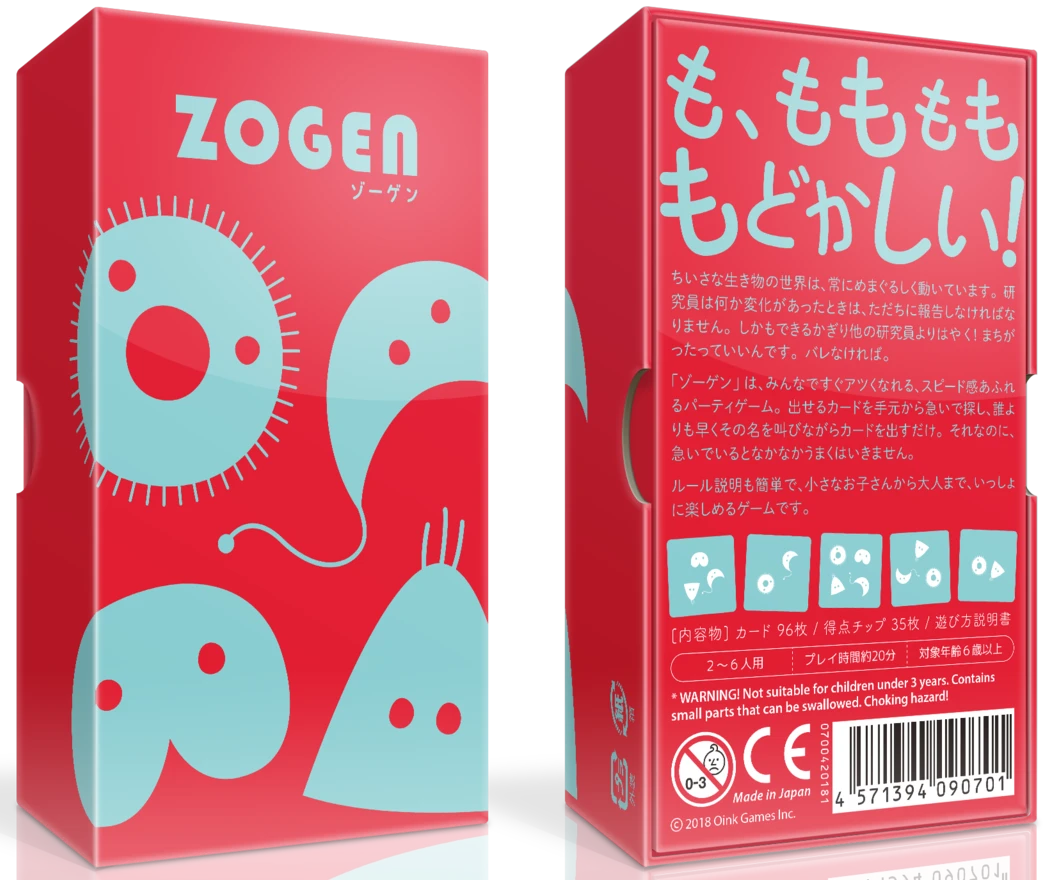 In Zogen, a.k.a. ゾーゲン, the player researchers want to rid themselves of their microorganism cards as quickly as they can, but they can do so only by observing the current lab environment and watching the one thing that changes, then “recording” it by playing their card.