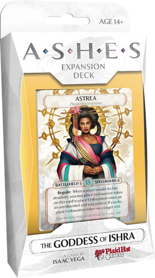 A new Phoenixborn enters the fray with The Goddess of Ishra expansion deck for Ashes: Rise of the Phoenixborn! All enemies kneel before Astrea, who provides enlightenment to all who seek her out. Spring into action with this full, ready-to-play deck, or use the cards you find here to build your own deck centered on the Phoenixborn of your choice. The Goddess of Ishra gives you the freedom to find new combinations of cards and unlock new types of decks. With each Ashes expansion deck, you can supplement your collection with new spell and unit cards in order to play out all-new battles!
