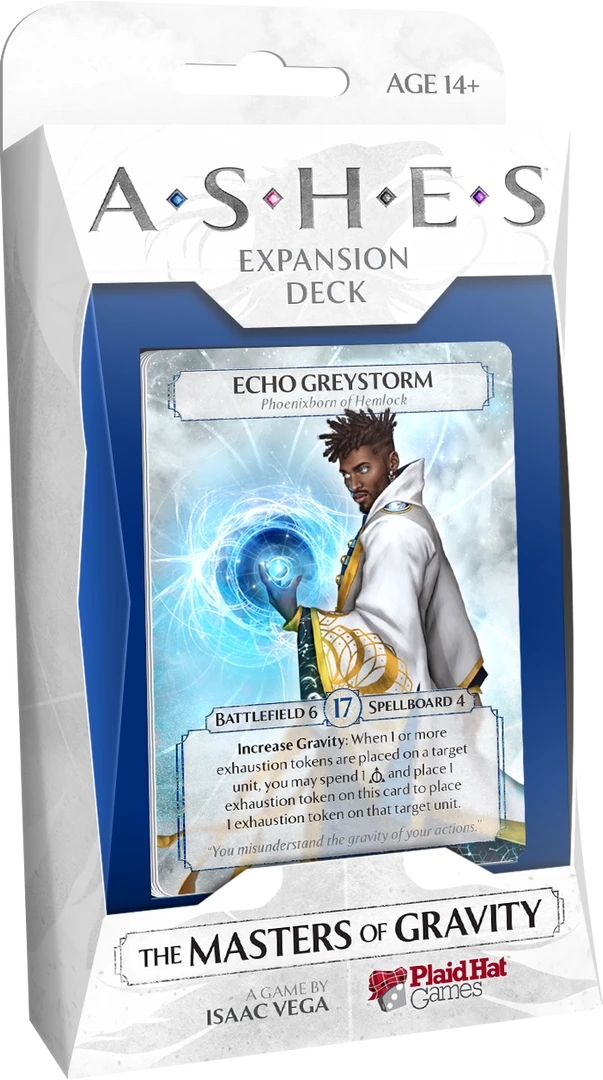 Harness the power of gravity itself with The Masters of Gravity expansion deck for Ashes: Rise of the Phoenixborn! This deck introduces a new Phoenixborn, Echo Greystorm, to the Ashes universe, giving you the freedom to explore new deck-building strategies that fit his unique abilities. Take control of your opponent’s every move by bending the very laws of physics to your will. Additionally, Echo is accompanied by a full deck of spell, ally, and other cards that can be incorporated into any Ashes deck, allowing you to supplement your collection and discover powerful new card combinations. With each card, you’ll find new ways to customize your Ashes experience and fight alongside your chosen Phoenixborn!