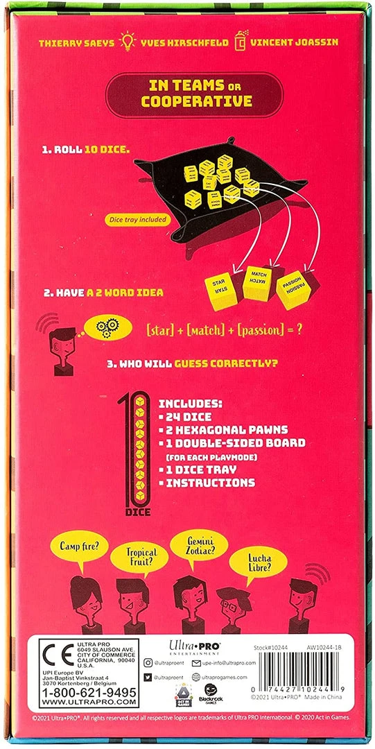 Everything starts with the roll of a dice. Each round, you roll a total of 10 dice. These dice and the words on them will serve as your inspiration! The goal is to come up with an idea born from the association of the number of words listed on the board. The idea can be whatever you want; an object, a character, a location, a title… there’s no limit!