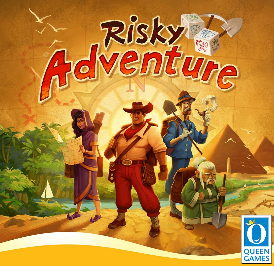 In the dice-rolling game Risky Adventure, players embark on expeditions and try to find rare artifacts in an undiscovered world. Each player assumes the role of three adventurers trying to roll the right dice combination to get equipment, discover artifacts, and find new and mysterious places. The trick: Players have to mark the things they want to roll for with their adventurers before they actually roll the dice. Assessing the risk, using the right equipment, and finding the best locations to place the adventurers will be key to win a game of Risky Adventure.