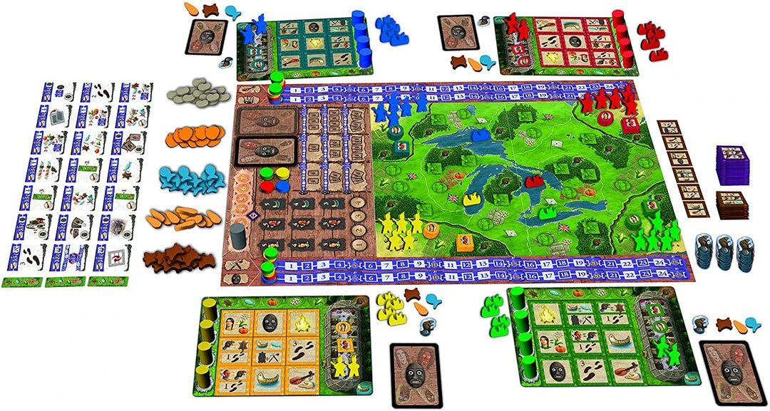 In the game Wendake, you are placed in the shoes of a chief of a Native American tribe. You have to manage all of the most important aspects of their lives, earning points on the economic, military, ritual, and mask tracks. The core of the game is the action selection mechanism: You have the opportunity to choose better and better actions over seven game rounds, and the winner will be the player who can find the best combinations of actions and use them to lead their tribe to prosperity. Each player has their own 3×3 action board that is comprised of nine action tiles. The first time you select an action tile each year, you may choose any tile; the second and third times that year, you must choose another action tile in the same column, row, or diagonal as your previously selected tile(s). If the action tile you choose shows more than one action, you can use them only in the order shown, from top to bottom. After the last player has placed (and resolved) their fourth action marker, the restore phase begins.