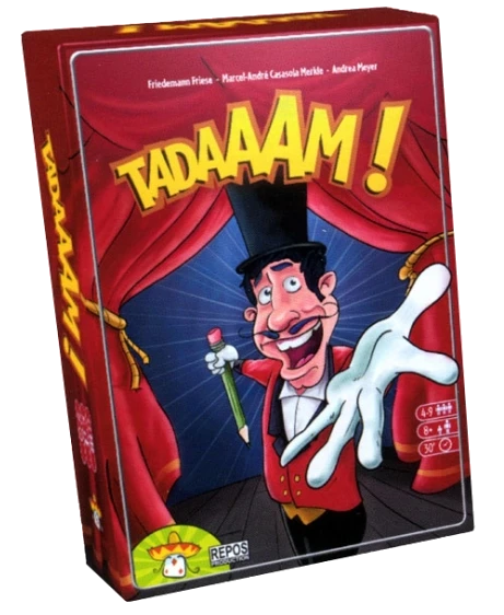 Tadaaam!ย is a revision and repackaging byย Cรฉdrick Caumontย andย Thomas Provoostย of the earlierย Monstermaler. The most obvious change is thatย Tadaaam!ย comes in a big box (Monstermaler was just a pad of paper), with cards to suggest people, and now also objects and animals, that players independently draw right and left halves of with pens on wipe-clean boards to make one recognisable picture. The pictures are then revealed and the players guess what those they didn’t draw are intended to be.
