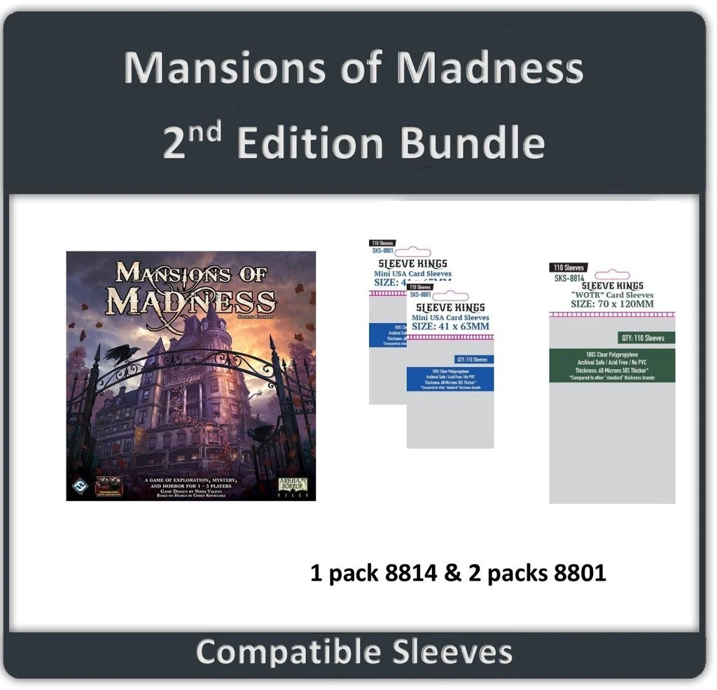 These are all the sleeves you need to sleeve everything for Mansions of Madness (2nd Edition). This bundle includes: