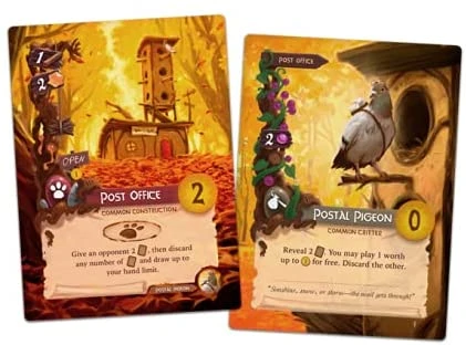 b) Play a Card: Each player is building and populating a city; a tableau of up to 15 Construction and Critter cards. There are five types of cards: Travelers, Production, Destination, Governance, and Prosperity. Cards generate resources (twigs, resin, pebbles, and berries), grant abilities, and ultimately score points. The interactions of the cards reveal numerous strategies and a near infinite variety of working cities.