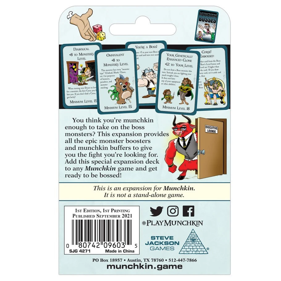 You’re pretty good at Munchkin โ stabbed some friends, looted some rooms, killed a few monsters, won some games โ and now you think you’re ready to take on the boss monsters. Well, look no further as Munchkin Bosses has all of the epic monster boosters and munchkin buffers to provide any player with a battle royale (with cheese). Add this special expansion deck to any Munchkin game and get ready to be bossed!