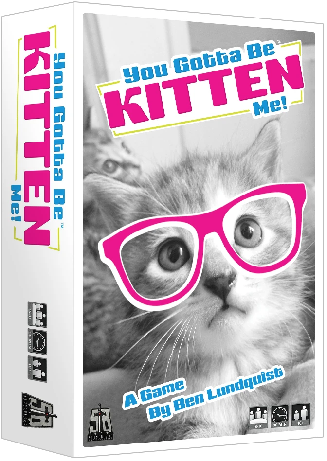 You Gotta Be Kitten Me! is a Liar’s Dice-style bluffing game in which players each hold cards that feature animals with some kind of accessory, such as hats, glasses and bow ties. Each turn, you try to guess โ or at least claim โ how many cards are in play with a certain color or accessory, either by raising the current bid or challenging another player. Whoever’s wrong loses a card, then you start a new round of play. The last player with cards remaining wins!