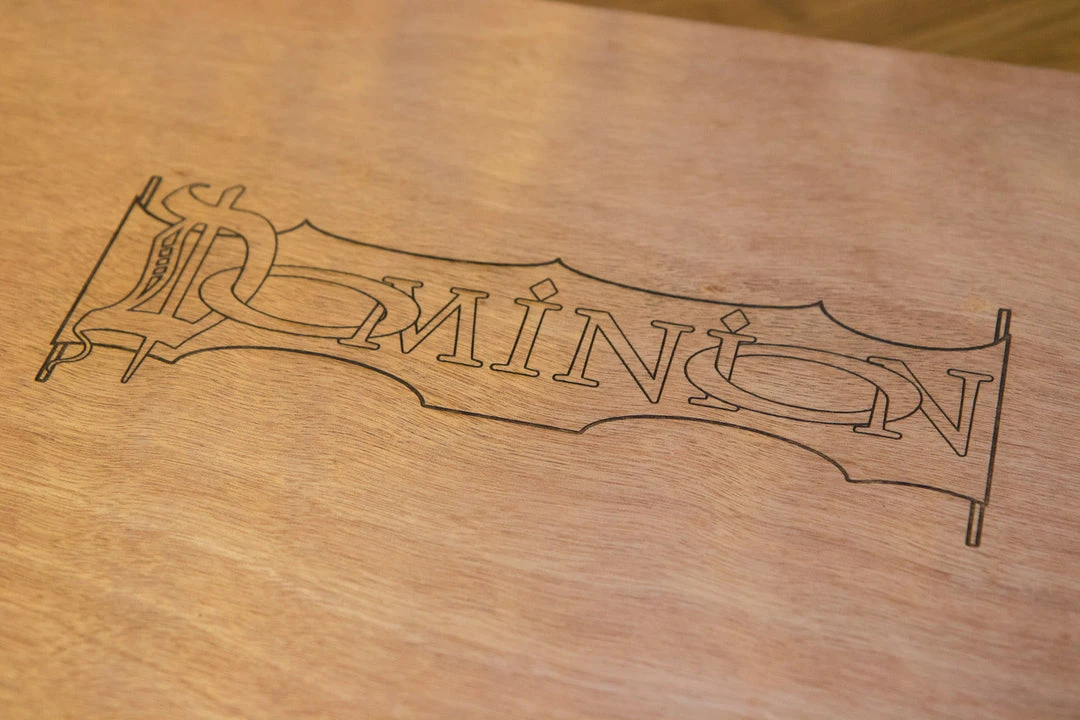 This custom wooden artist case is designed to store all eight Dominion expansions and features the Dominion logo prominantly engraved on the top of the box.