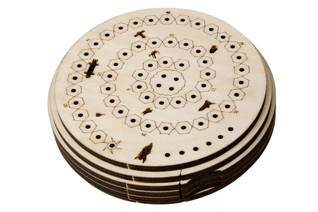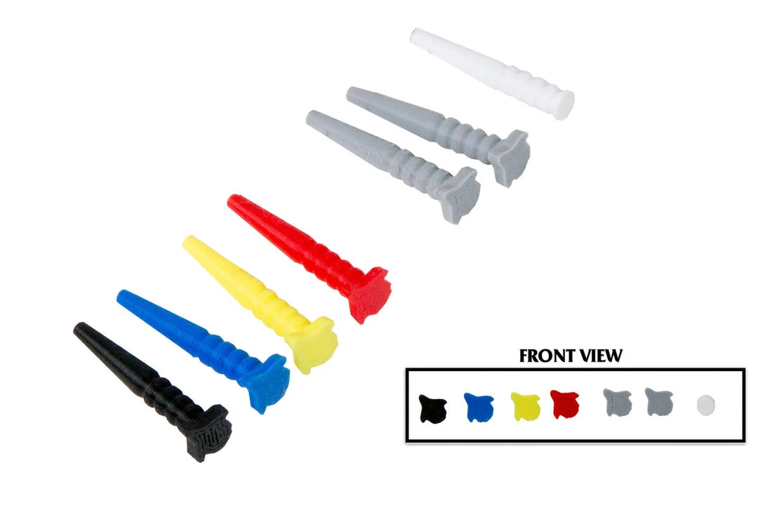 Includes one red, one yellow, one blue, and one black peg to take place of the player ship pieces, two gray for the non-player ships, and one white peg for use as a round marker.