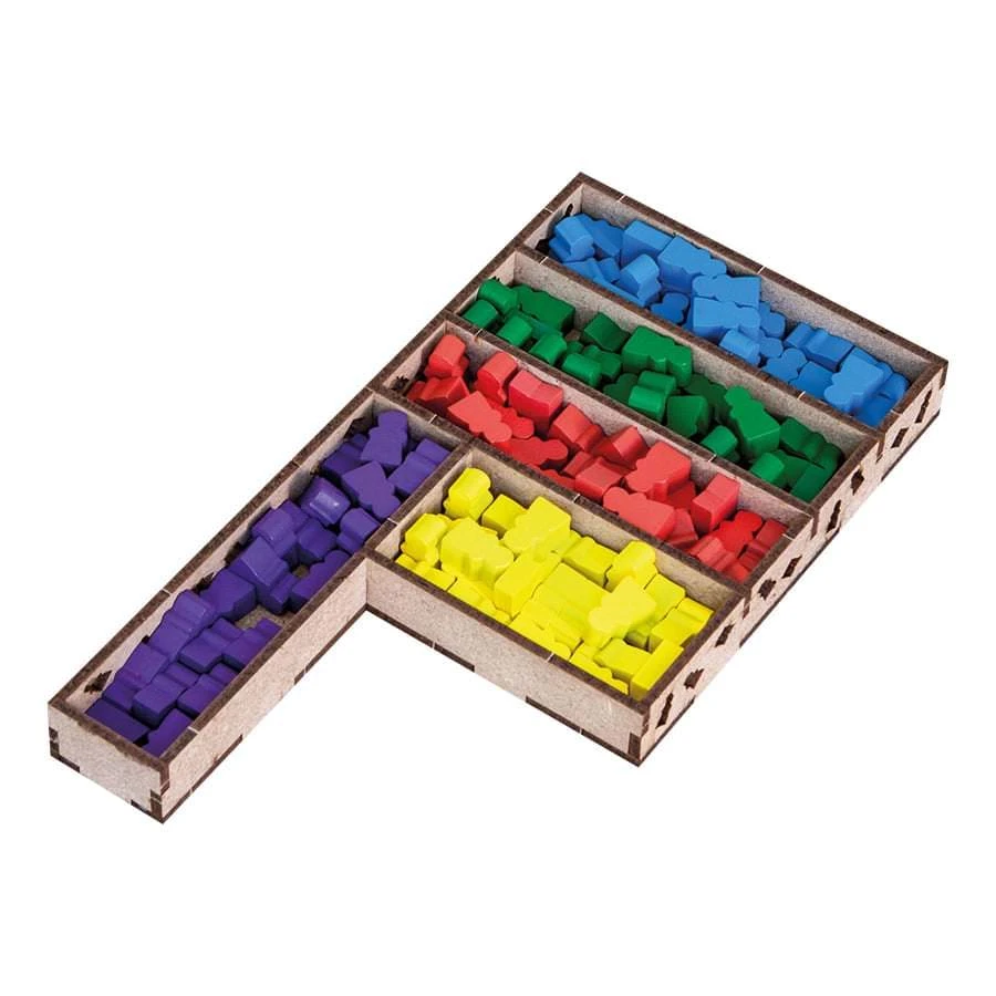 • 1x box with spaces for player meeples, with 5 separated housings; space for cardboard tax warehouse (kickstarter exclusive).