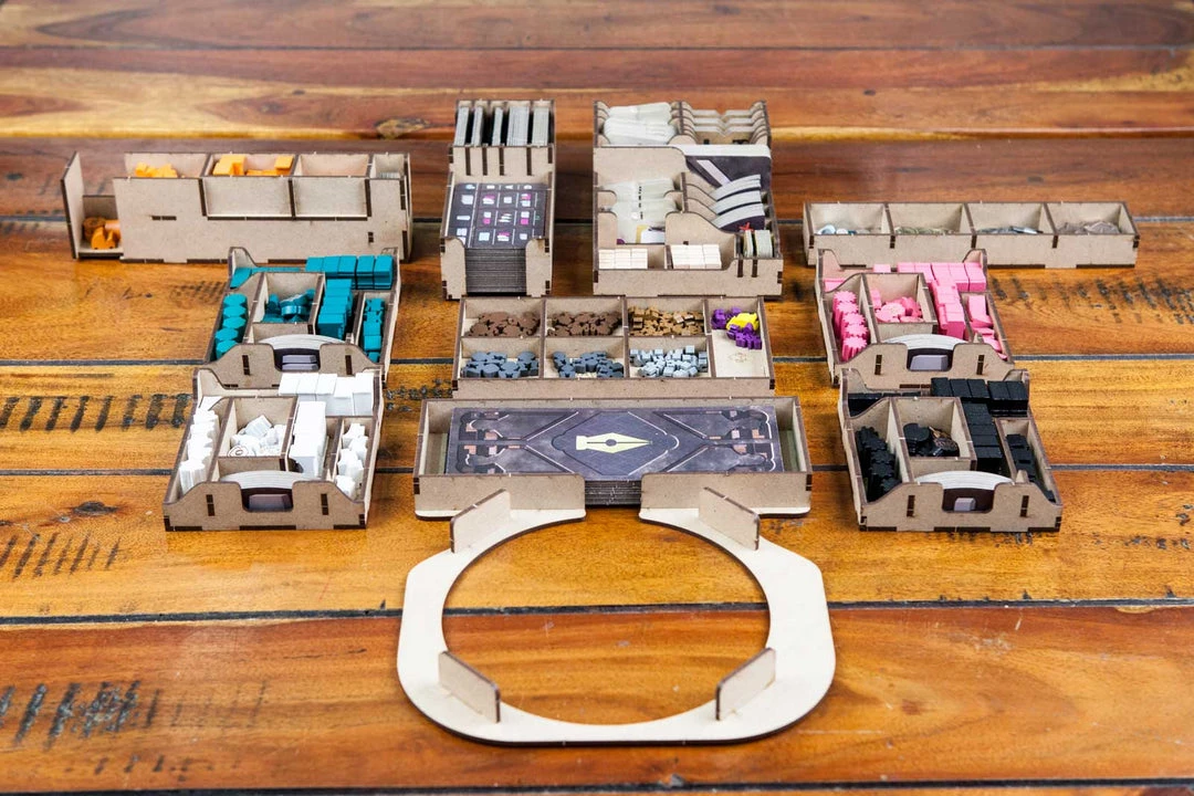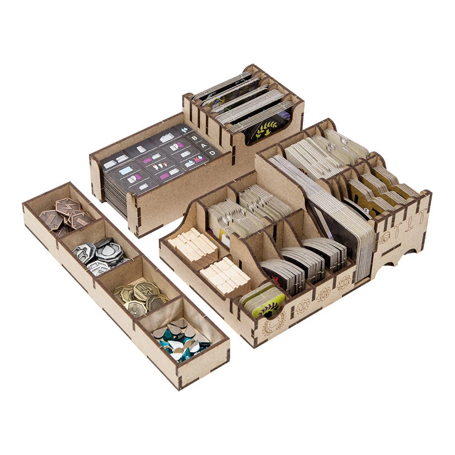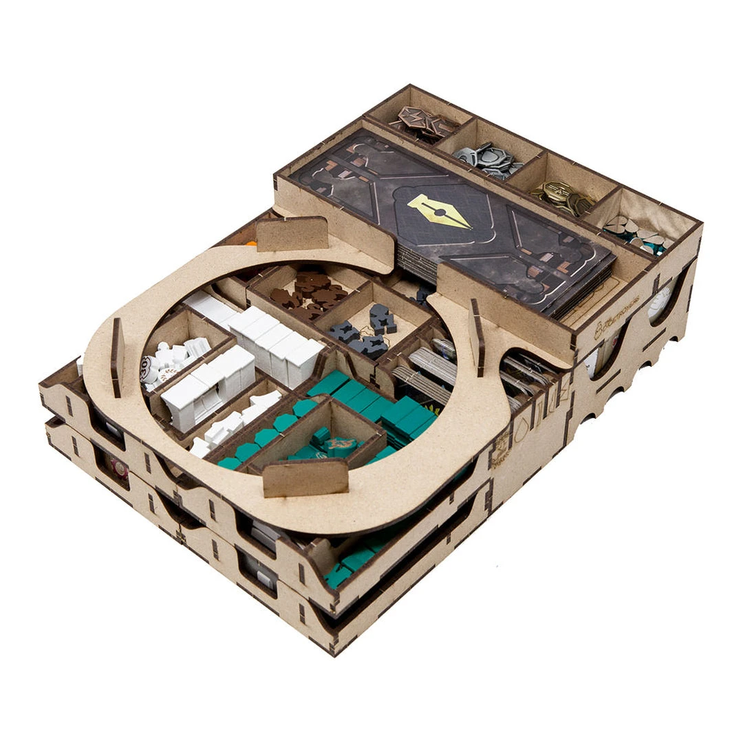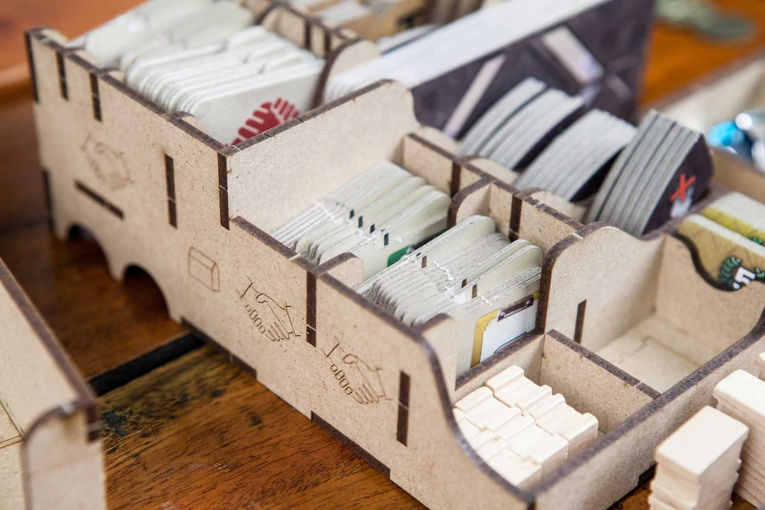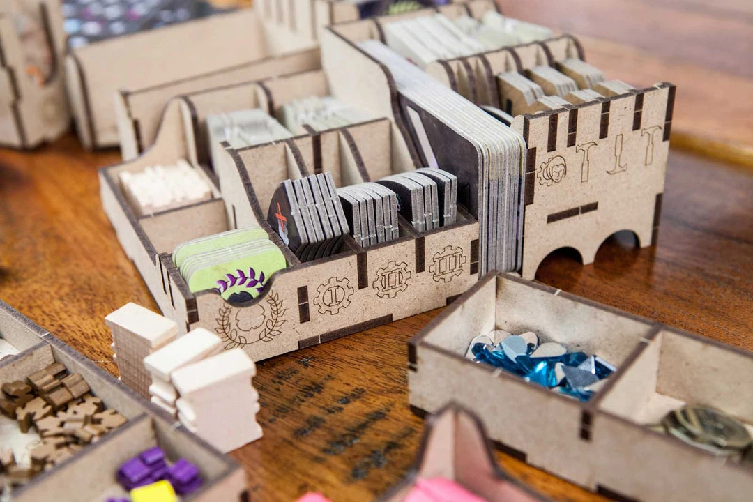 Organizer compatible with Barrage + The Leeghwater Project. Here is available our bundle for the organizer + our 4 wooden construction wheels set (click here for details on our construction wheels set). Includes custom slots for kickstarter exclusives (meeples and other additional / substitute components, such as metal coins and drops).