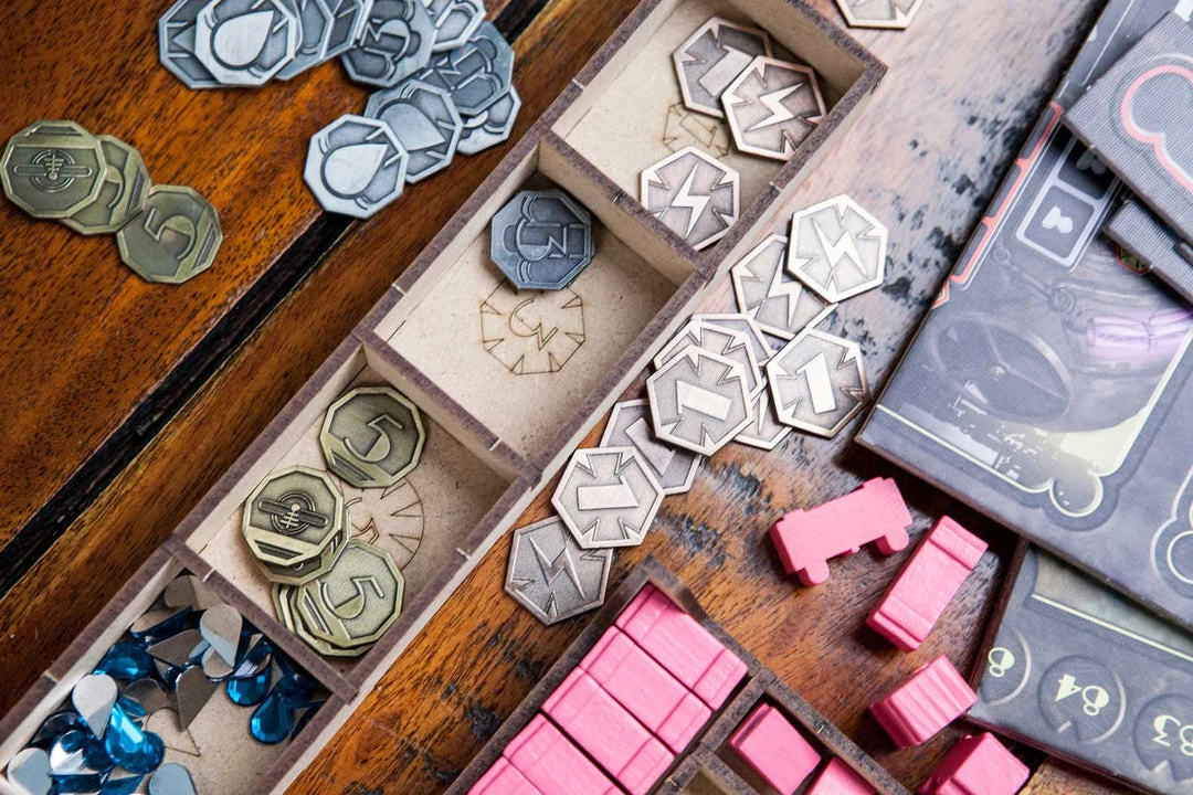 โข 1x coin holder, with slots for each value. Compatible for cardboard or metallic kickstarter coins. Lateral space for water markers (kickstarter or retail version);