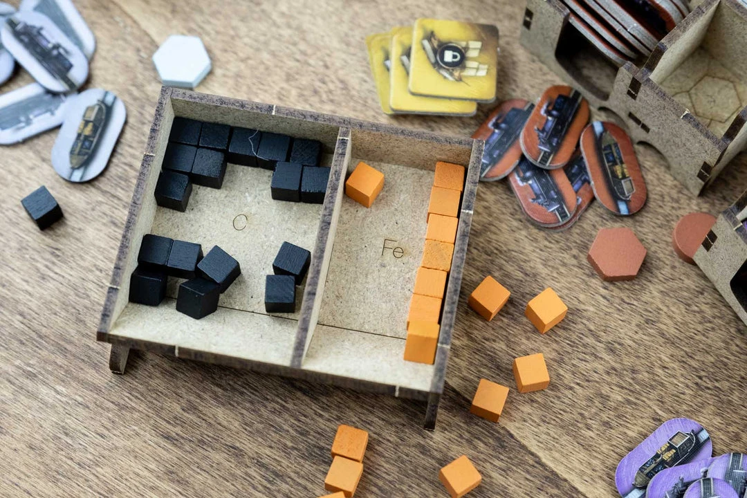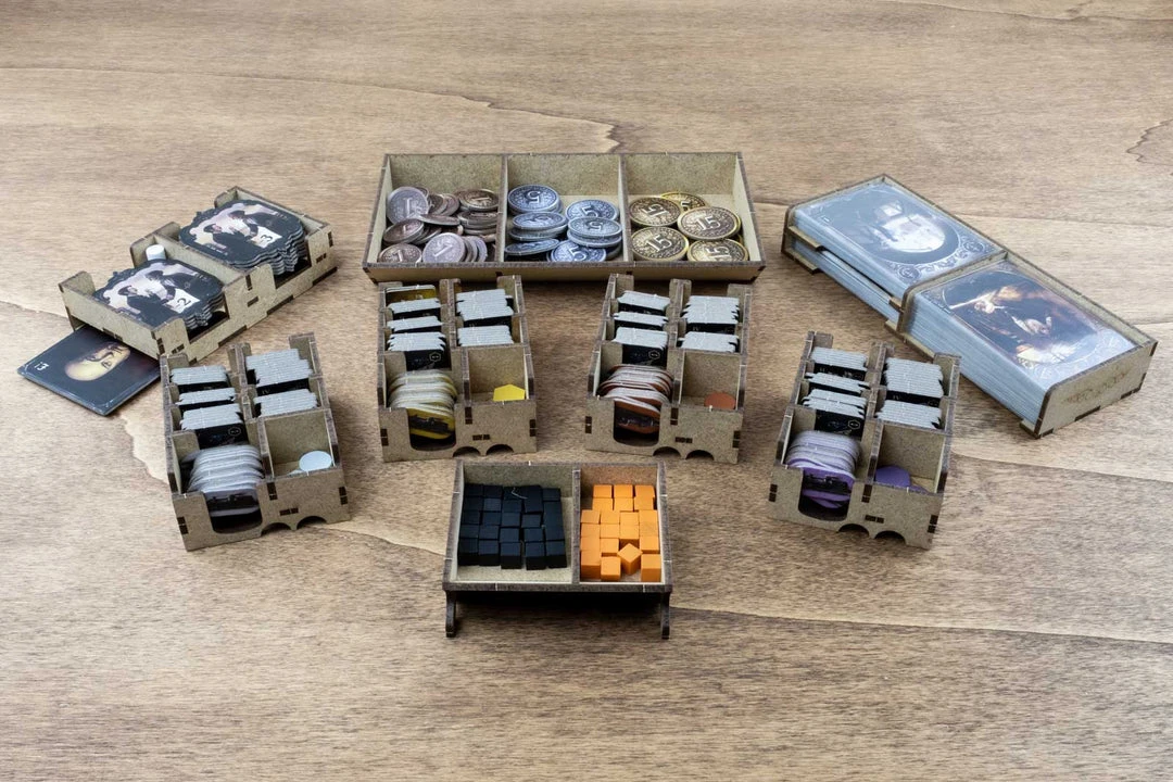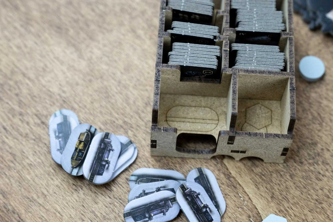 - 4x player set boxes. Slots for buildings divided by type; canals/rails; markers. Bottom slot for character token;
