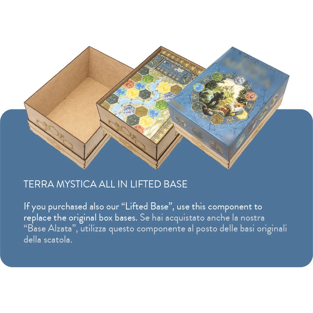 Designed to fit into the core game + one of the expansion boxes. If the whole organizer is put into the core game box, the lid will sit by approximately 5 cm; AT THIS LINK is available our lifted base, which will allow to put the whole organizer in it, with flush closure of the lid. Also compatible with “Terra Mystica Big Box”: in this version lid will sit approximately 2cm high.