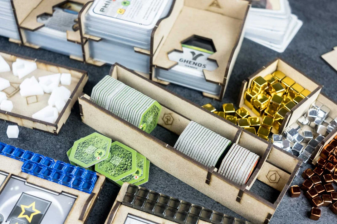 • 5x player boards, designed for inserting the game’s cardboard inside. Spaces divided by individual productions and reserves. Laser cut top to accommodate all player cubes and delegates. In one gesture, each player will be ready for the game;