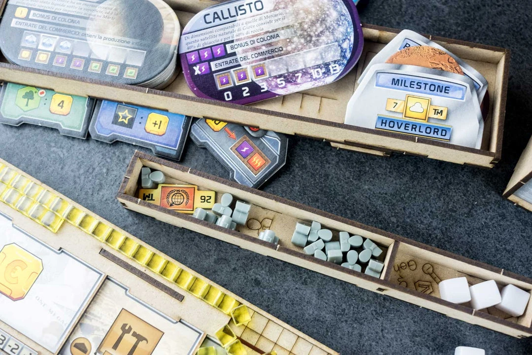 Organizer compatible with Terraforming Mars. Space for core game plus expansions: Prelude; Venus Next; Hellas & Elysium; Colonies; Turmoil.
