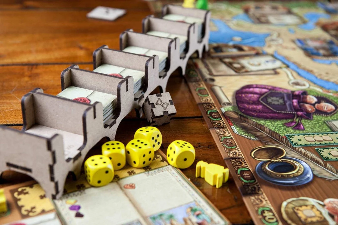 • 1x resource and coin holder, with 9 slots to keep each resource and 1x and 3x meeples separate, shutter opening for easy access to the pieces.