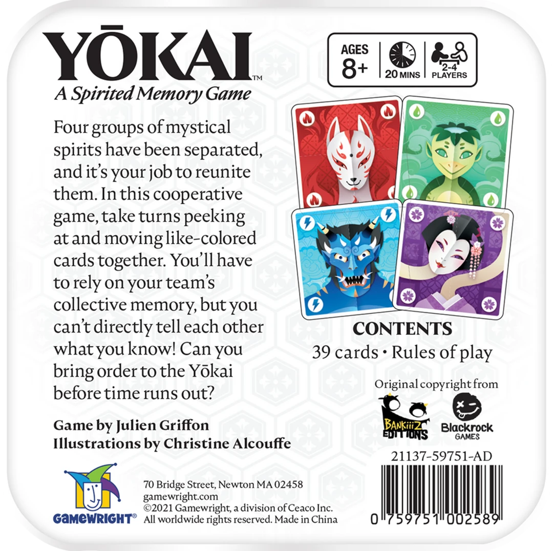 Four groups of mystical spirits have been separated and it’s your job to reunite them. In this cooperative game, take turns peeking at and moving like-colored cards together. You’ll have to rely on your team’s collective memory, but you can’t directly tell each other what you know! Can you bring order to the Yōkai before time runs out?